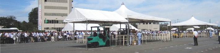 この大会は、フォークリフトの運転競技を通して、遵法精神と安全意識の高揚、運転の知識と技能の向上を図り、職場における安全作業の確立と労働災害の防止を目的として厚生労働省の後援、公益社団法人全日本トラック協会及び一般社団法人日本産業車両協会の協賛、またコマツリフト株式会社、ニチユ三菱フォークリフト株式会社、ユニキャリア株式会社、トヨタL&F埼玉株式会社、住友ナコマテリアルハンドリング販売株式会社からのご協力をいただき開催されました。 |