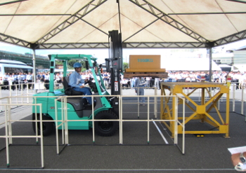 ディーゼル・トルコン車を使い、決められたコースを走行し、必要な荷の積み卸し等を限られた時間の中で行います。迅速かつ正確にコースを走り、的確にフォークリフトを操作する技量には感嘆しました。 |