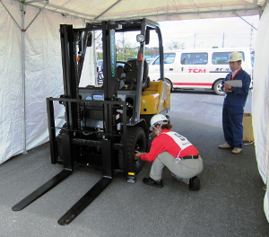 フォークリフトの作業開始前点検は、労働安全衛生規則により義務付けられています。作業開始前にフォークリフトの点検を適切に行い、不具合箇所を見つけるという設定です。限られた時間の中ですばやく点検が行われました。 |